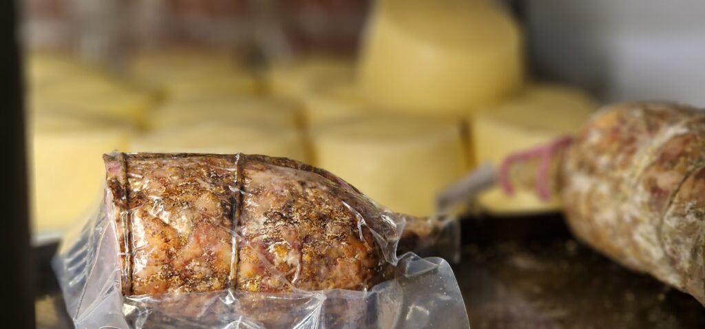 La Macelleria: il sapore del tempo e della cura. La nostra macelleria è il luogo della scelta e della precisione. Selezioniamo con maestria i tagli della nostra carne per garantirvi tenerezza e gusto in ogni portata. Ma è nel silenzio della stagionatura che accade la magia: qui produciamo i nostri salumi artigianali, lavorati secondo tradizione e lasciati maturare finché non raggiungono l’equilibrio perfetto. Una filiera che non conosce scorciatoie.